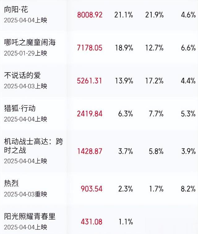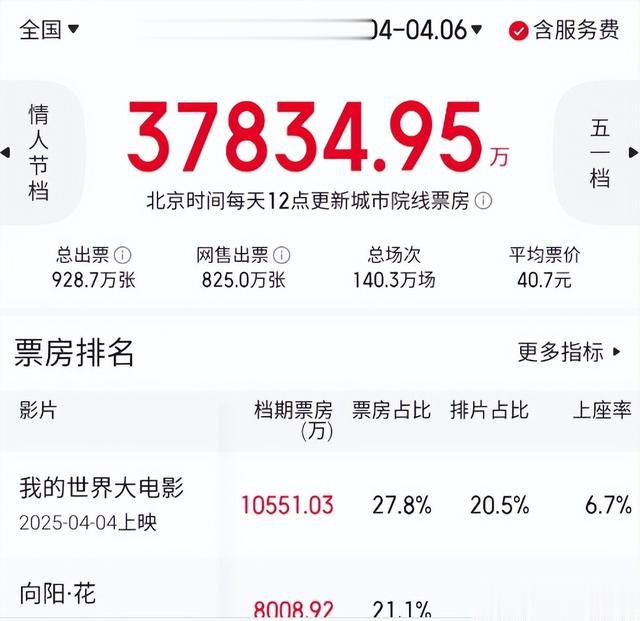 回顾一下清明档,上映的16部新片中,聚焦聋人、刑释人员等弱势群体的现实题材影片虽占主流,却因题材沉重、宣发乏力,票房普遍惨淡,清明档以3.78亿票房刷新历史新低,单日票房一度不如商场奢侈品店营业额。例如《阳光照耀青春里》三天仅收431万,排片效益(B值)低至0.2,场次严重过剩。与此同时,进口片《我的世界大电影》以低幼化剧情和游戏IP效应收割1.05亿票房,成为档期唯一破亿影片,但其豆瓣评分仅5.8,口碑与票房倒挂现象凸显。而被观众看好的《向阳花》与《不说话的爱》也没能凭借演员的名声实现逆袭。